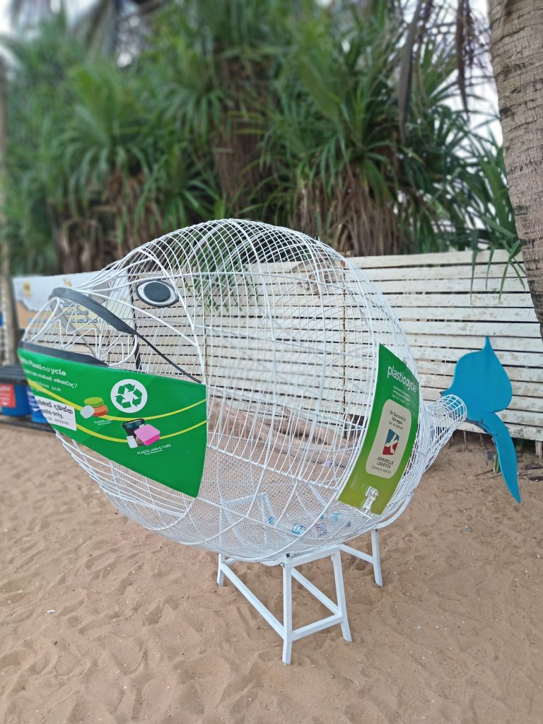 Plasticcycle, in partnership with John Keells Logistics, has successfully implemented a creative and aesthetically appealing solution aimed at addressing the issue of plastic waste. The implementation of a fish-shaped receptacle on the premises of Mount Lavinia Beach on the 11th of March 2023 was a proactive measure in combatting plastic pollution. This noteworthy initiative was further supported by a beach clean-up activity led by the committed employees of John Keells Logistics. In addition to these efforts, Plasticcycle conducted an awareness session highlighting the importance of responsible plastic waste management, thereby solidifying the impact of this initiative.